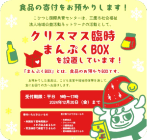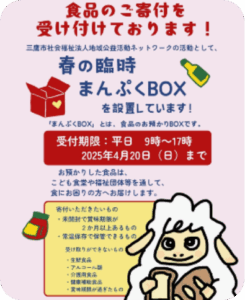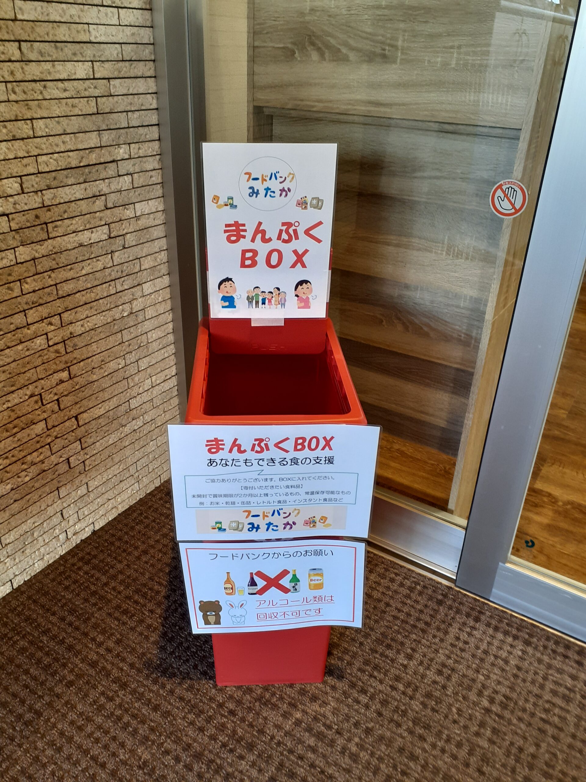 本ネットワークでは、NPO法人フードバンクみたかと連携した食支援に取り組んでいます。食品の寄付を受け付ける「まんぷくBOX」を設置し、集まった食品をフードバンクみたかの事務所へ運搬しています。