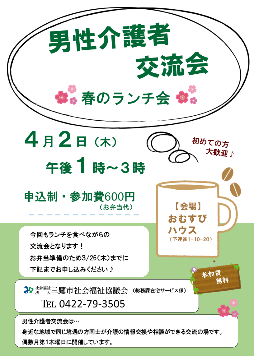 男性介護者交流会は、身近な地域で同じ境遇の方同士が介護の情報交換や相談ができる交流の場です。