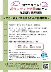 三鷹市内で食でつながるボランティア活動を行っている、または今後行いたいと考えている方を対象に、食品衛生管理研修を開催します!